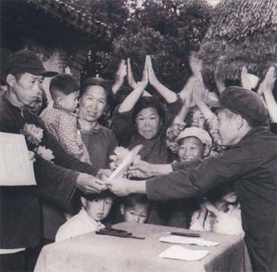 1953年3月1日,选举法公布实施。同年下半年,建国以来第一次普选开始,这是凤城县边门区老爷庙村选举委员会将当选证书发给人大代表。